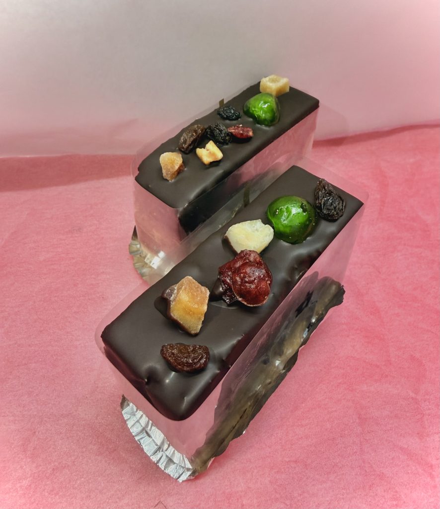 スポンジと生クリームを混ぜ合わせた物を焼きバレンタイン仕様でチョコレートを上からかけドライフルーツをトッピングした商品になります。生地はとってもしっとりしていてシナモンがほんのり香り、チョコレートとドライフルーツとの相性抜群です。