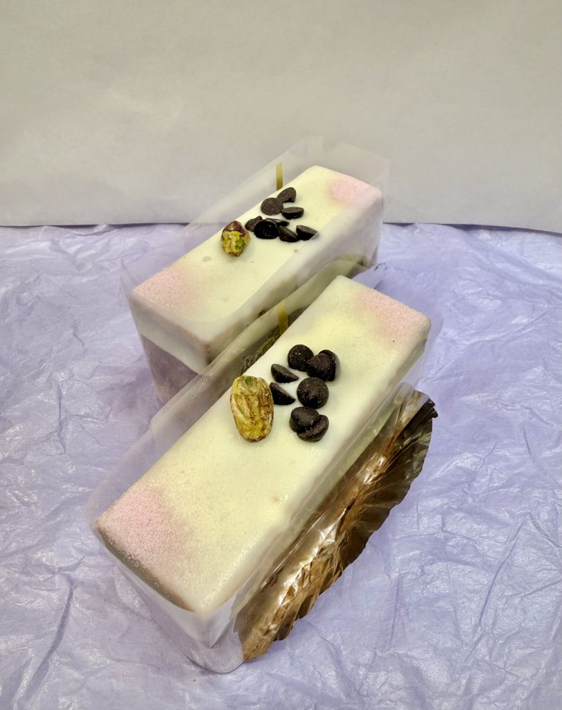 こちらもノワールと同じ生地になっています。ノワールよりサクサクとした食感が楽しめます。こちらの方はホワイトチョコレートを使用していてトッピングにはチョコチップとピスタチオ、ピンクのパウダーをかけています。とても可愛らしい商品となっています。